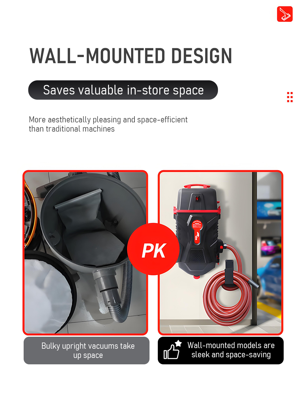 • Space-saving alternative to mobile vacuums