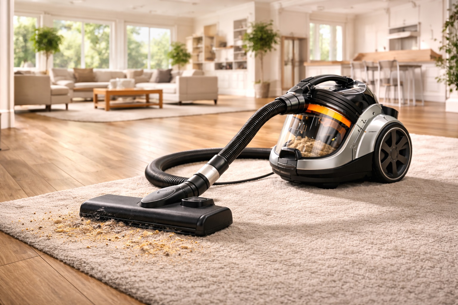 Carpet cleaning: Deep suction lifts dirt and pet hair from thick carpet fibers.