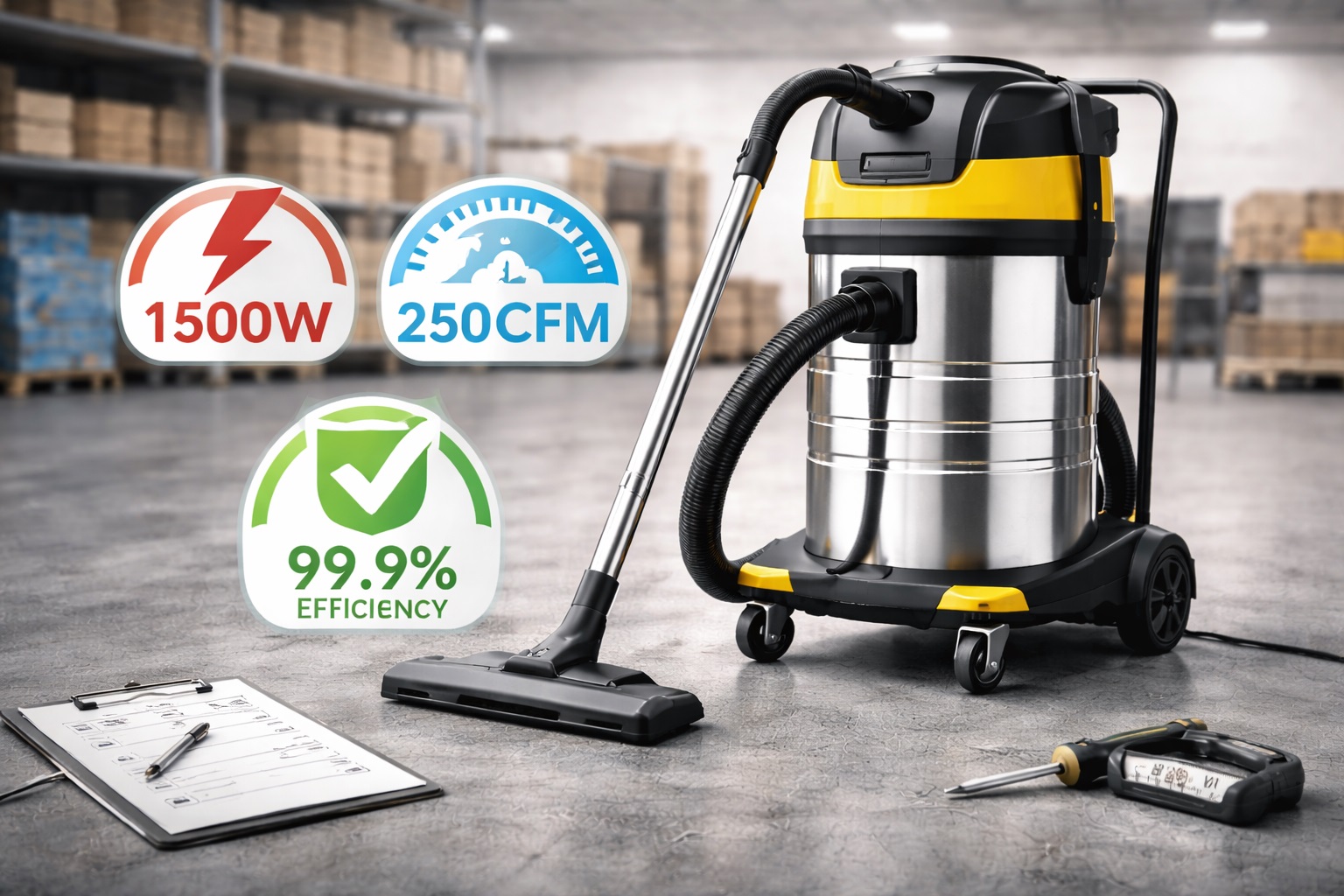 A professional high suction vacuum cleaner maintains performance under load, even as filters fill with debris.